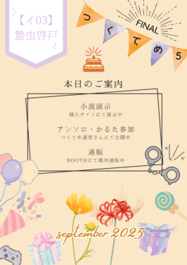 あとサークルカット完全に失念していて、数日前の私はお品書きばかり必死で作っていたんですが使うことがなかったのでここにアップしておきます。つくてめ5FINAL開催おめでとうございます。開催ありがとうございます。既存作品の公開のみではありますが、長年続いてきた素晴らしいイベントにこうして参加することができとても嬉しいです。
