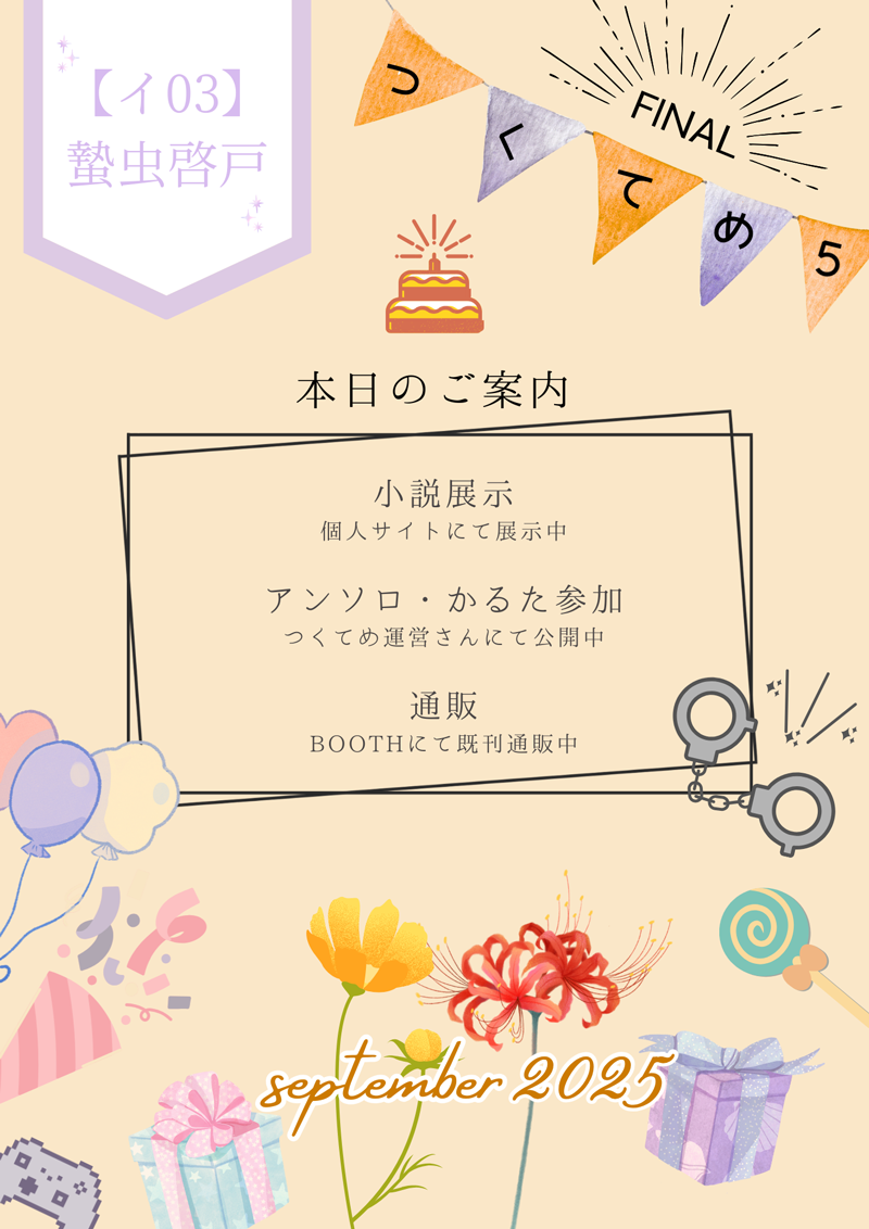 あとサークルカット完全に失念していて、数日前の私はお品書きばかり必死で作っていたんですが使うことがなかったのでここにアップしておきます。つくてめ5FINAL開催おめでとうございます。開催ありがとうございます。既存作品の公開のみではありますが、長年続いてきた素晴らしいイベントにこうして参加することができとても嬉しいです。